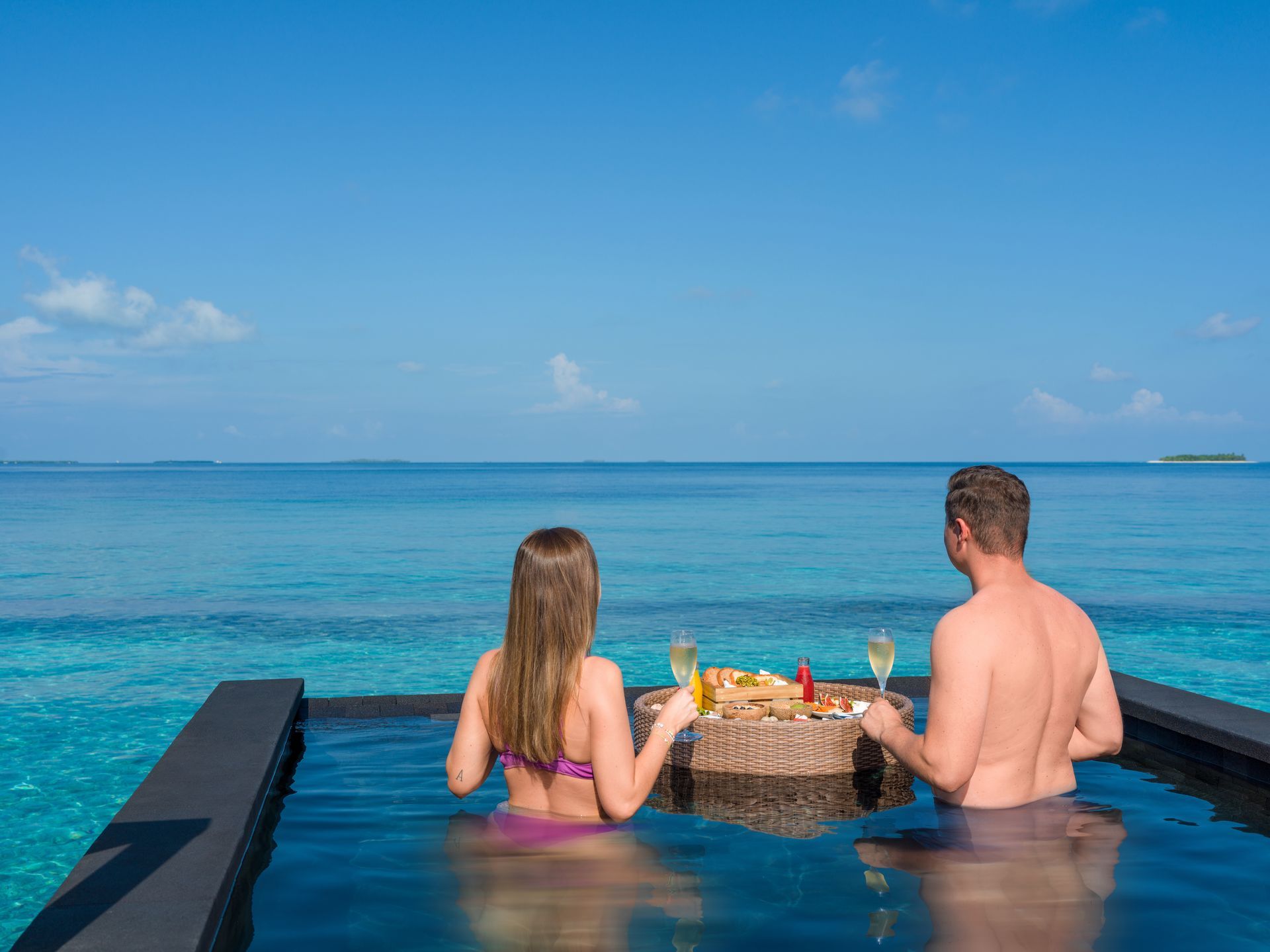 Our Sunset Pool Villa showcases magnificent sunset views over the water as well as direct access from the villa to the abundance of marine life found in the ocean below from your sun deck. Enjoy up-close observations of diverse ocean life through a glass panel in the floor, refresh in the infinity pool and unwind in luxurious interiors.